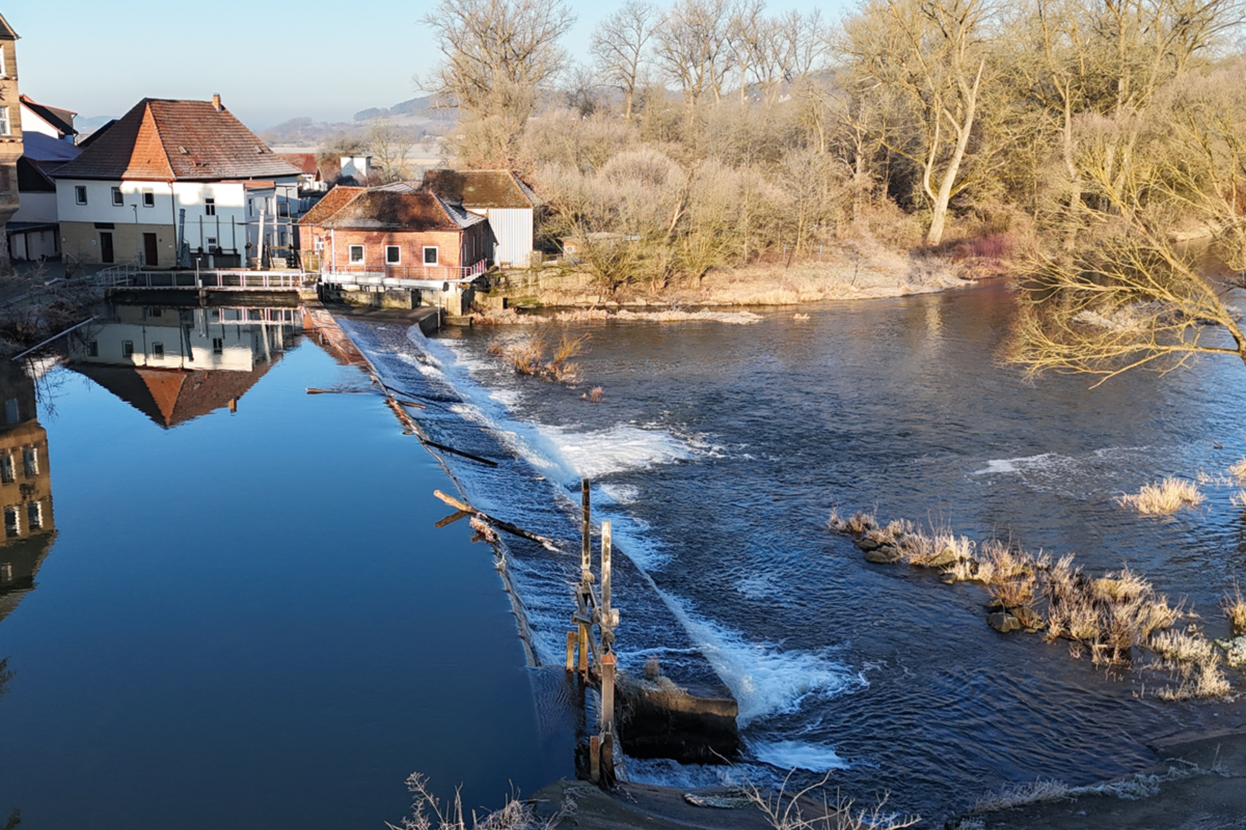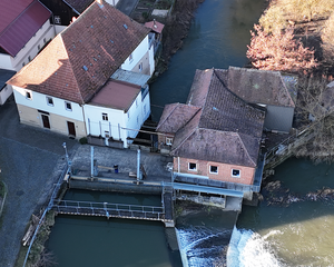 Unser Triebwerk nutzt das Wasser nach dem Zusammenfluss von Rotem und Weißem Main. Während das Triebwasser der Mühlturbinen über einen langen Unterwasserkanal von ca. 300 m Länge wieder dem Main zugeführt wird, wird das Triebwasser der ursprünglichen Sägeturbine direkt am längsangeströmten Wehr mit 75 m Breite wieder dem Main-Mutterbett zugeleitet. Das Eichpfahlprotokoll stammt von 1857, der Einbau der ersten Turbinen erfolgte 1910. Die ehemalige Mühle besteht seit 1762 und wurde bis 1974 über Generationen betrieben.